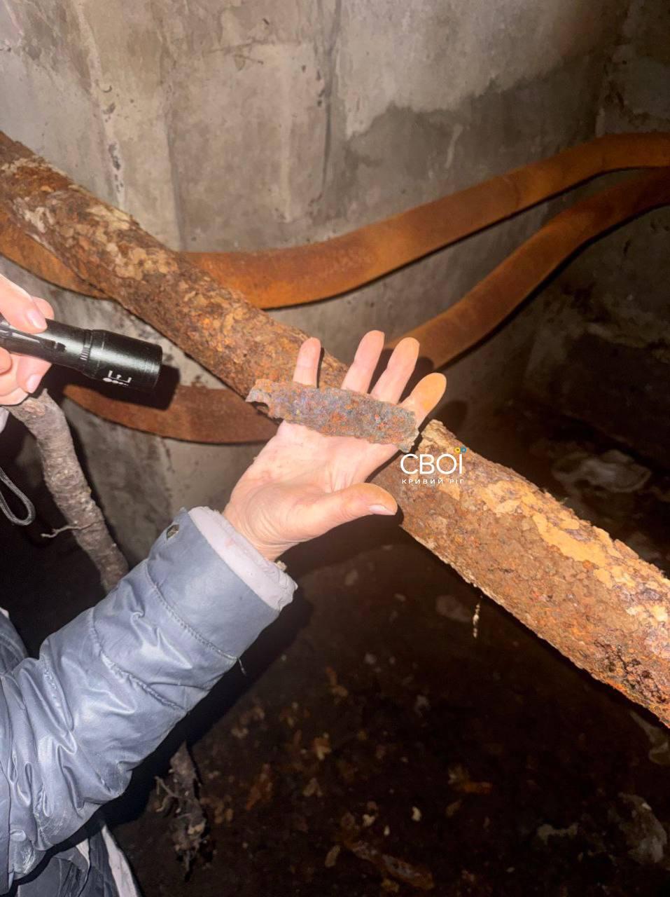 По словам обитателей квартир, в управляющей компании им объясняют отсутствие воды и тепла нехваткой специалистов и материалов для замены аварийных труб в подвале. Трубы там выглядят полностью проржавевшими и сгнившими, от них отваливаются куски.