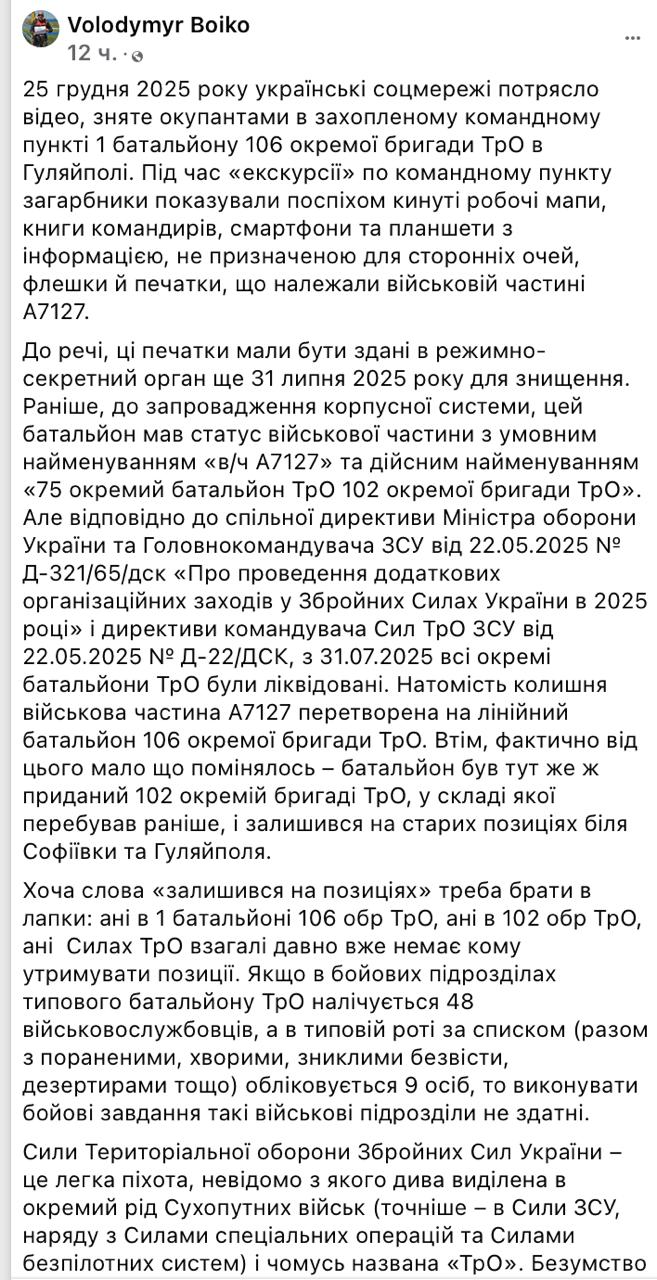 "Ни в 1-м батальоне 106-й ОБр ТрО, ни в 102-й ОБр ТрО, ни в силах ТрО (которые отвечали за этот участок обороны в Гуляйполе - Ред.) вообще уже давно некому удерживать позиции. Если в боевых подразделениях типового батальона ТрО насчитывается 48 военнослужащих, а в типовой роте по списку (вместе с ранеными, больными, пропавшими без вести, дезертирами и т. д.) числится 9 человек, то выполнять боевые задачи такие воинские подразделения не способны. Батальоны ТрО ВСУ - это, пожалуй, самые истощённые и измотанные войной подразделения ВСУ. Но именно от их боеспособности в первую очередь зависит, насколько далеко противник продвинется вглубь Украины. Потому что только пехота удерживает территорию… И именно поэтому боевые потери ТрО, комплектование ТрО по остаточному принципу и массовое дезертирство пехоты являются тремя компонентами поражения Украины в войне с Россией", - заявляет журналист.