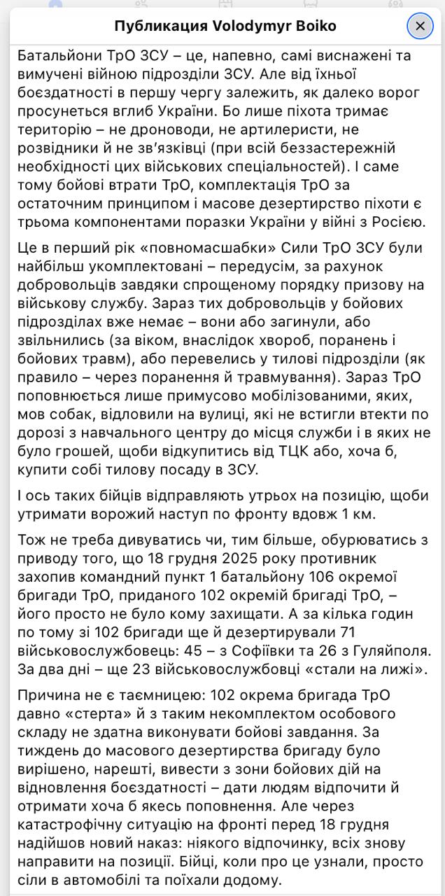 "Причина не является тайной: 102-я отдельная бригада ТрО давно "стёрта" и с таким некомплектом личного состава не способна выполнять боевые задачи. За неделю до массового дезертирства бригаду было решено, наконец, вывести из зоны боевых действий на восстановление боеспособности - дать людям отдохнуть и получить хотя бы какое-то пополнение. Но из-за катастрофической ситуации на фронте перед 18 декабря поступил новый приказ: никакого отдыха, всех снова направить на позиции. Бойцы, когда об этом узнали, просто сели в автомобили и уехали домой", - рассказал Бойко.