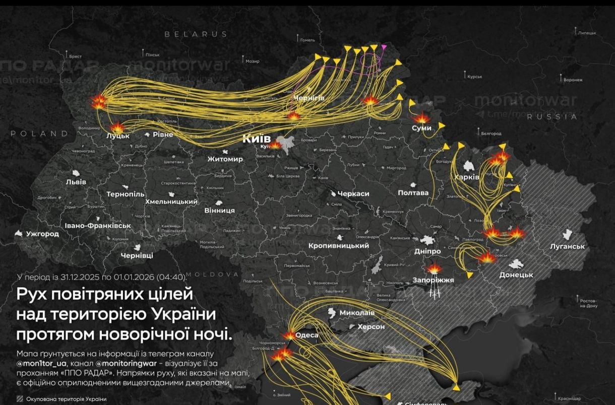 В новогоднюю ночь войска РФ запустили более 200 дронов по Волынской, Ровенской, Запорожской, Одесской, Сумской, Харьковской и Черниговской областям.