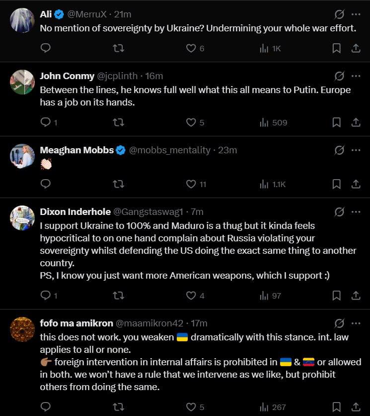 "Я на 100% поддерживаю Украину, и Мадуро - бандит, но мне кажется лицемерным с одной стороны жаловаться на то, что Россия нарушает мой суверенитет, а с другой - защищать США, которые делают то же самое с другой страной", - ответил Сибиге один из пользователей.