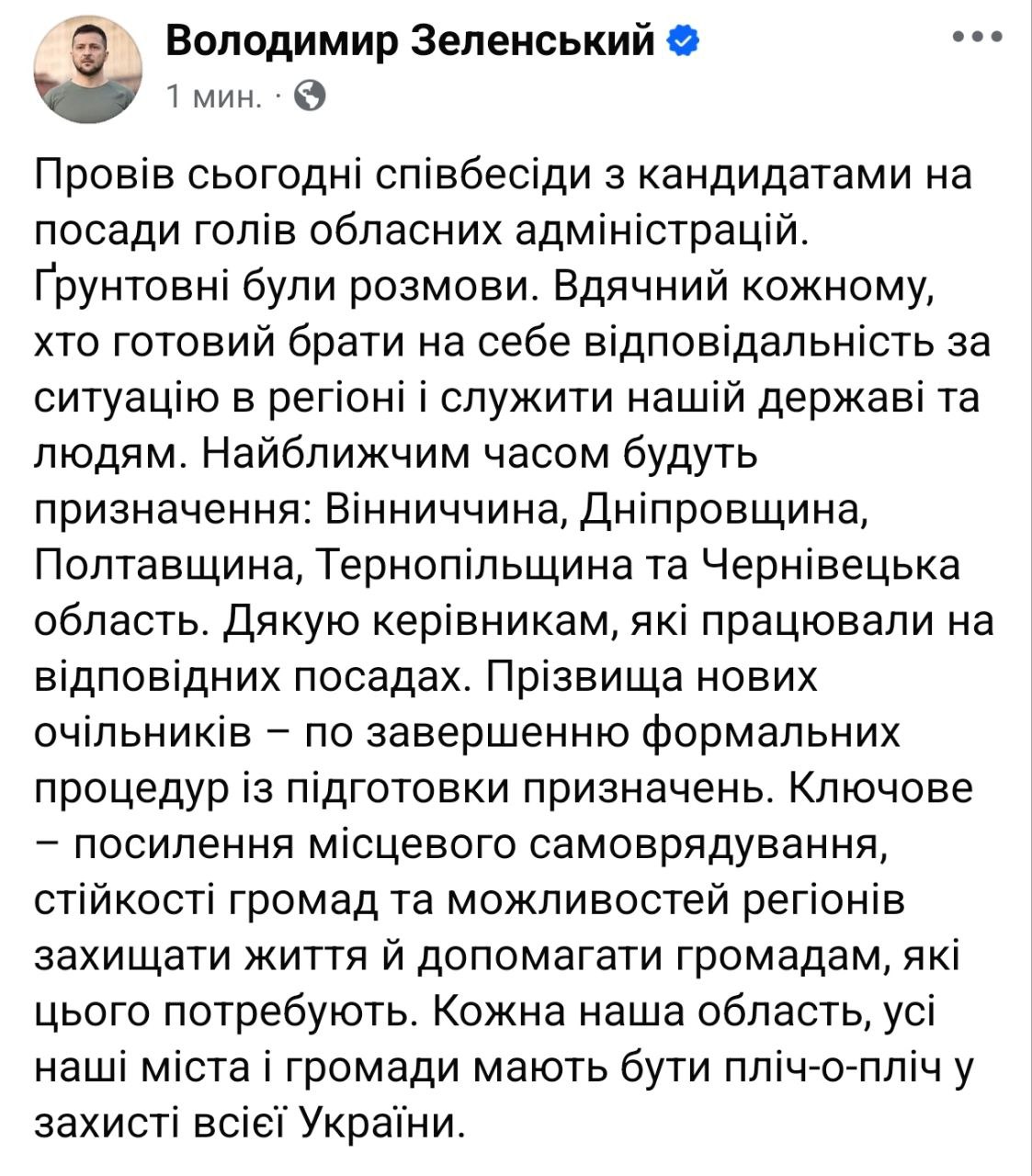 17:47 Зеленский анонсировал замену губернаторов Винницкой, Днепропетровской, Полтавской, Тернопольской и Черновицкой областей уже в ближайшее время.