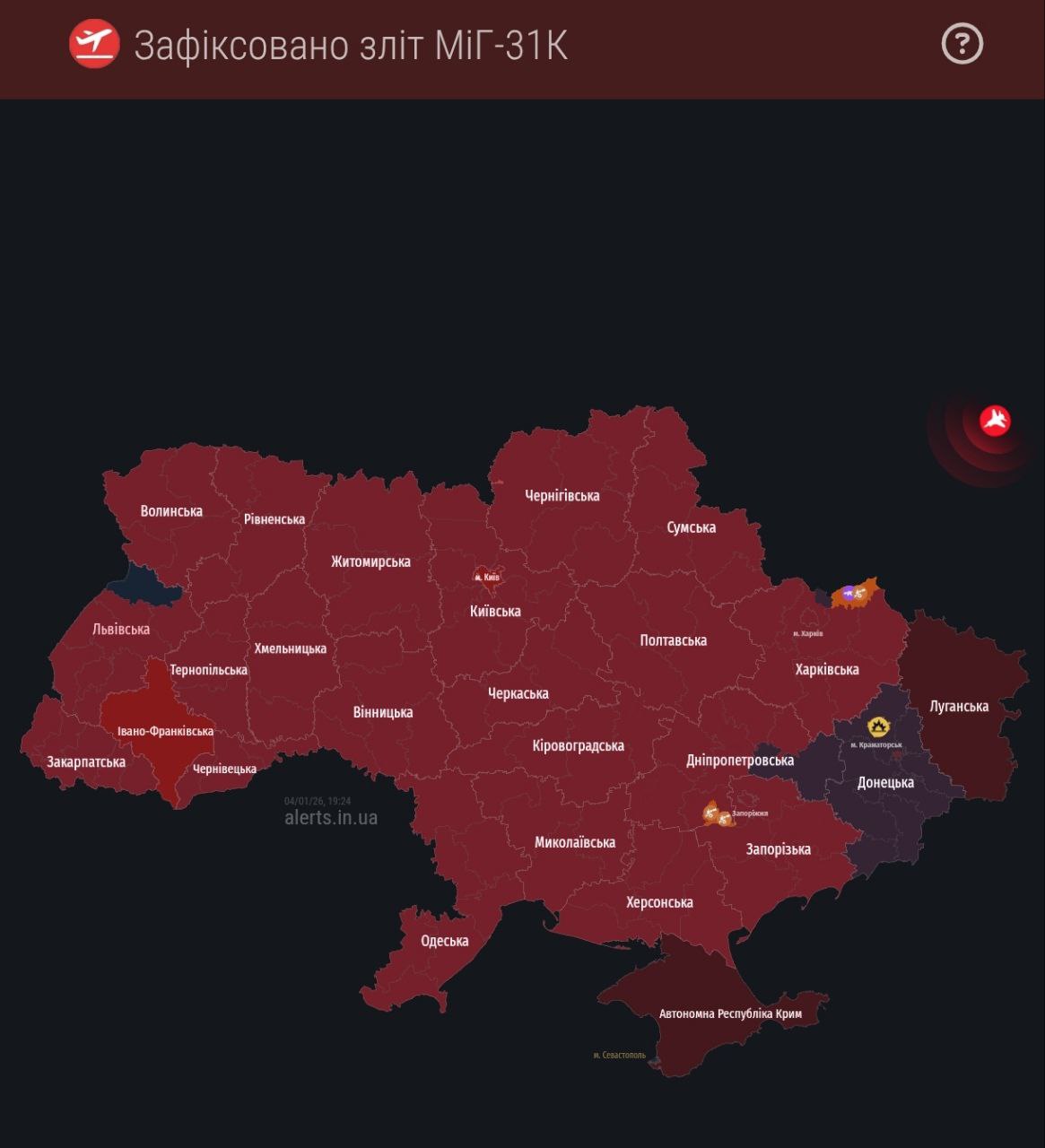 19:27 Почти по всей Украине воздушная тревога из-за МиГ-31К.