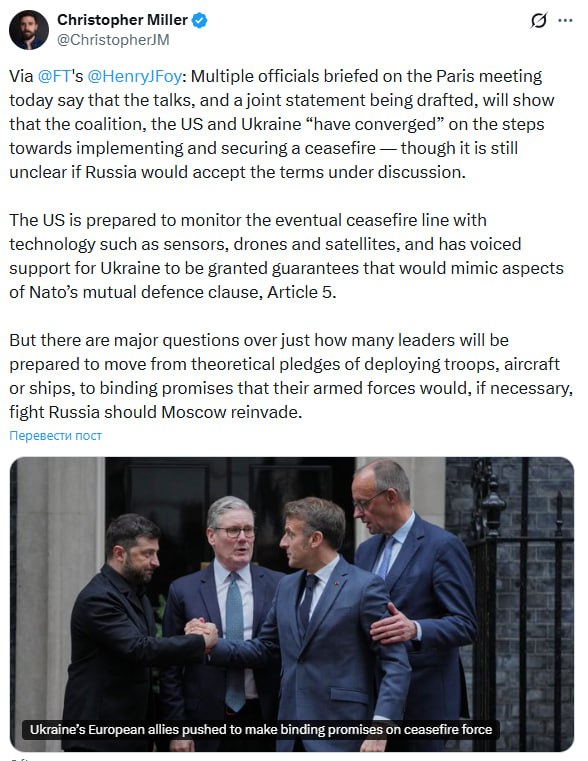 Напомним, РФ выступает категорически против присутствия западных войск в Украине после прекращения огня.