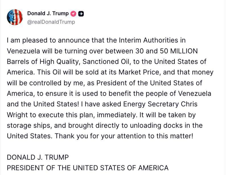 "Эта нефть будет продаваться по рыночной цене, и эти деньги будут контролироваться мной, как президентом США, чтобы гарантировать их использование на благо народа Венесуэлы и Соединенных Штатов! Нефть будет доставлена ​​на судах-хранилищах непосредственно на разгрузочные причалы в Соединенных Штатах", - написал глава Белого дома.