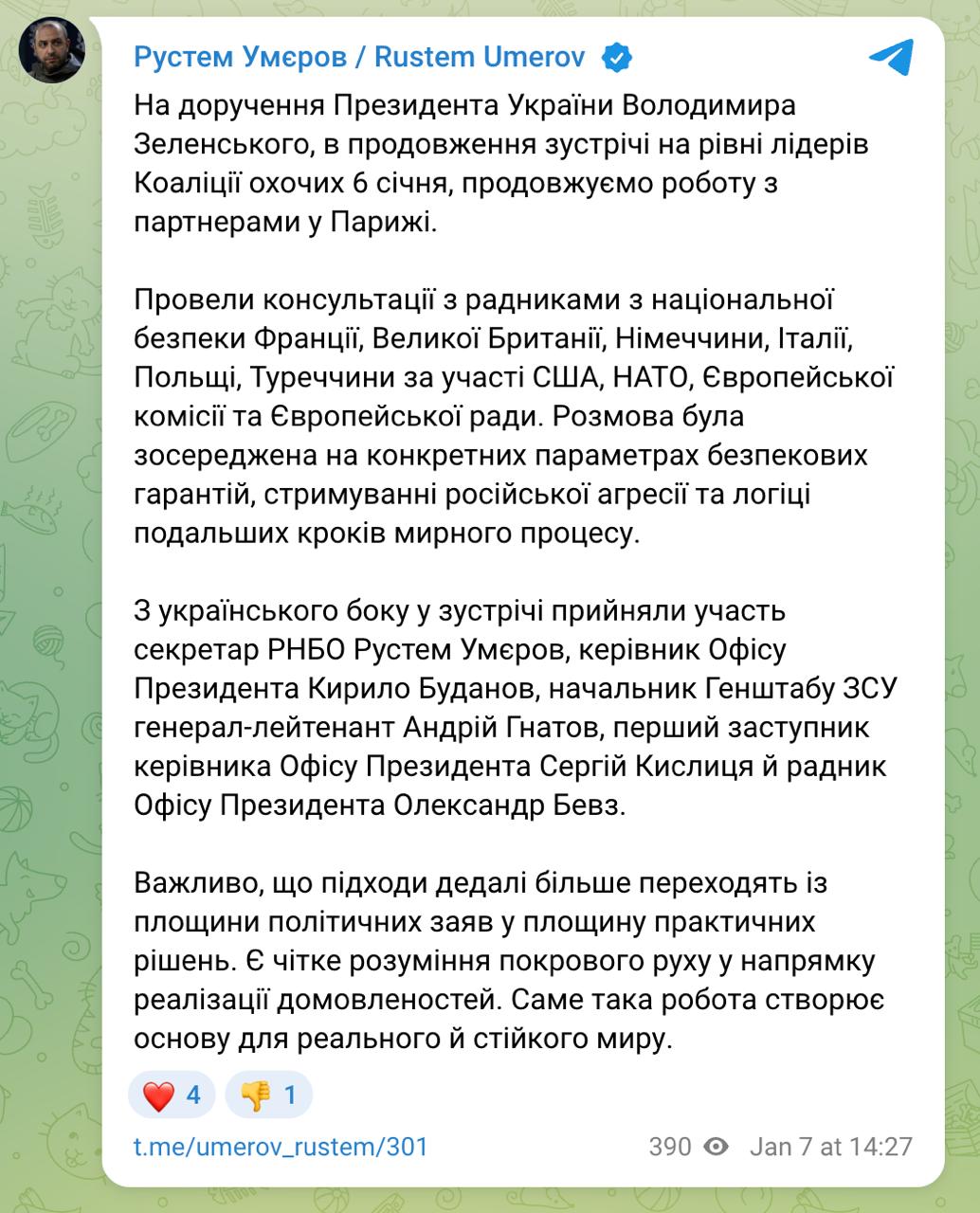 Как мы писали, после встречи с Уиткоффом Зеленский заявил, что Украина и США продолжат переговоры в Париже.