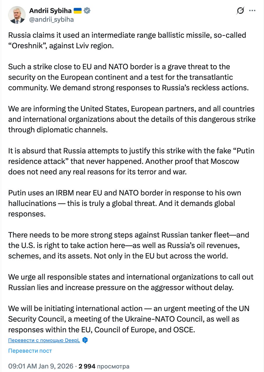 "Такой удар вблизи границы ЕС и НАТО представляет серьезную угрозу безопасности европейского континента и является испытанием для трансатлантического сообщества. Мы требуем решительных мер в ответ на безрассудные действия России. Мы информируем Соединенные Штаты, европейских партнеров, а также все страны и международные организации о деталях этого опасного удара по дипломатическим каналам. Мы инициируем международные действия: срочное заседание Совета Безопасности ООН, заседание Совета Украина-НАТО, а также ответные меры в рамках ЕС, Совета Европы и ОБСЕ", - написал министр.