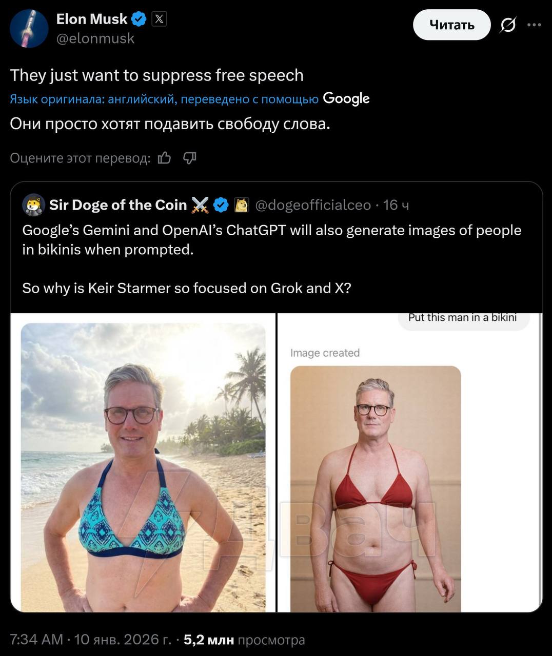 В ответ Илон Маск запостил фотографии Стармера в женском купальнике, сгенерированные чат-ботом Grok которого тот критиковал.