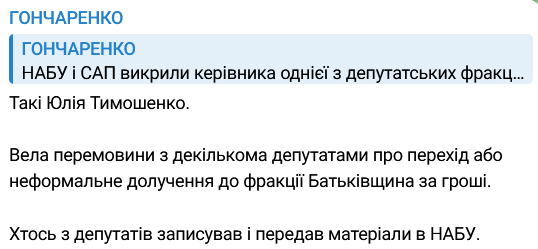 "Это Юлия Тимошенко. Она вела переговоры с несколькими депутатами о переходе во фракцию "Батькивщина" за денежное вознаграждение или за неформальное присоединение к БЮТ. Кто-то из депутатов записывал эти переговоры и передал материалы в НАБУ", - написал Гончаренко в своем телеграм-канале.