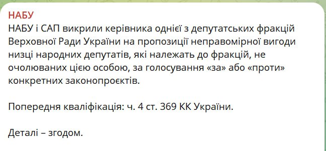 Национальное антикоррупционное бюро Украины (НАБУ) и Специализированная антикоррупционная прокуратура (САП) разоблачили руководителя одной из депутатских фракций Верховной Рады за предложение "неправомерной выгоды" ряду народных депутатов из других фракций за голосование "за" или "против" конкретных законопроектов.