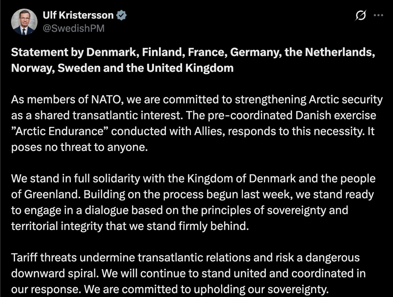 "Тарифные угрозы подрывают трансатлантические отношения и грозят опасной нисходящей спиралью. Мы будем и впредь действовать единодушно и скоординированно. Мы привержены защите нашего суверенитета", - заявили Дания и ее союзники.