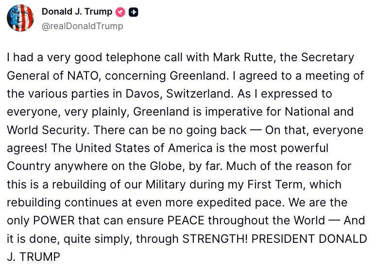 "Как я всем очень ясно дал понять, Гренландия имеет первостепенное значение для национальной и мировой безопасности. Обратного пути нет - в этом все согласны! Соединенные Штаты Америки - самая могущественная страна на планете, с большим отрывом", - написал глава Белого дома.