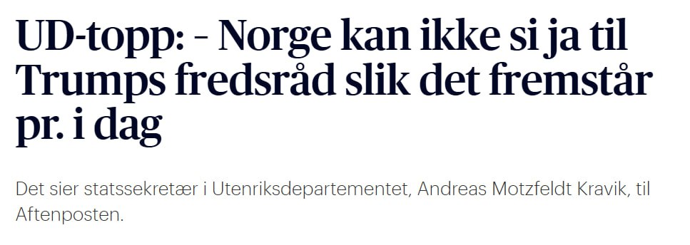 "Совершенно очевидно, что мы не можем быть частью структуры, которая бросает вызов роли ООН и существующему международному праву. Это было бы совершенно невозможно для нас", - сказал Кравик, комментируя возможность участии Норвегии в Совете мира.