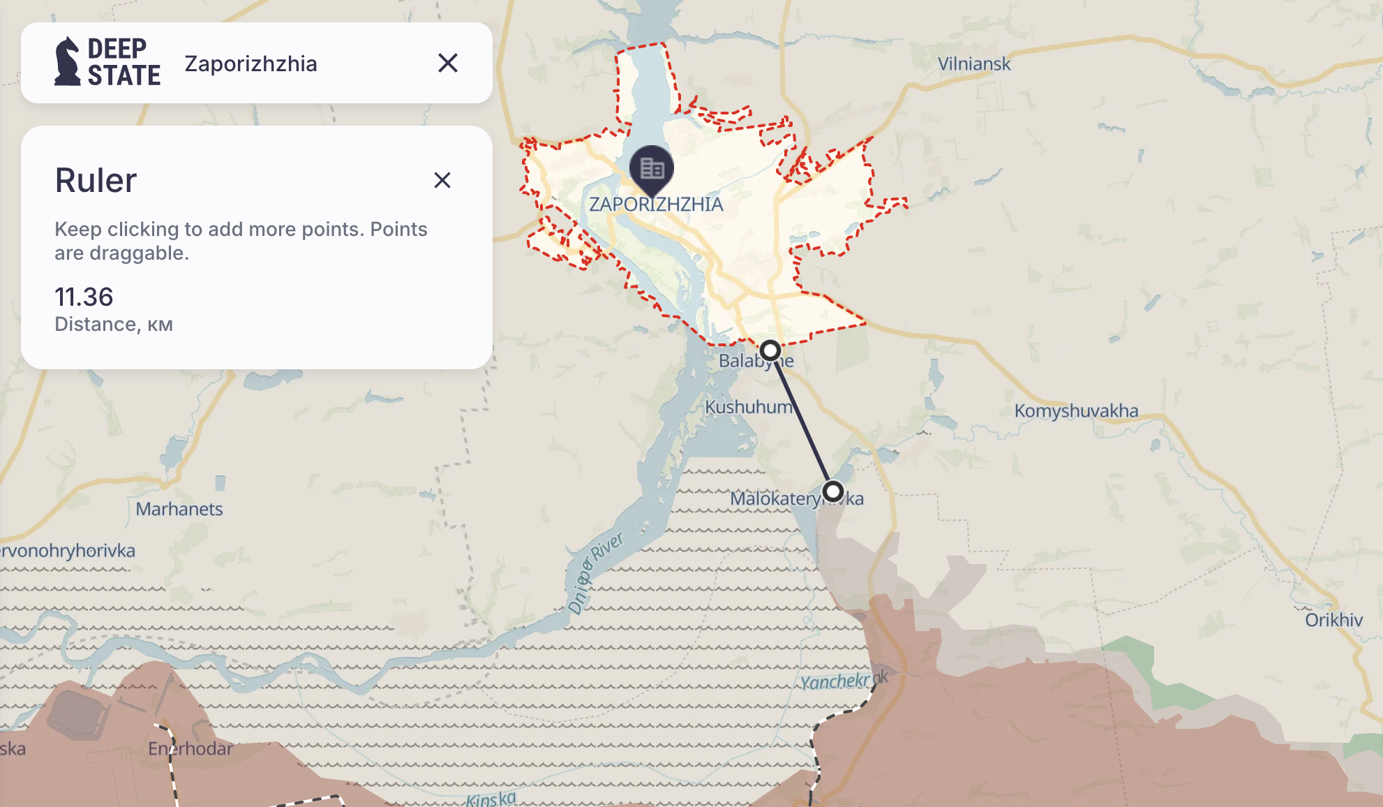 Отметим, что это соответствует и украинским данным. Судя по карте Deep State, от "серой зоны" в райне Приморского и реки Конка по прямой до южных окраин областного центра даже меньше 12 км.