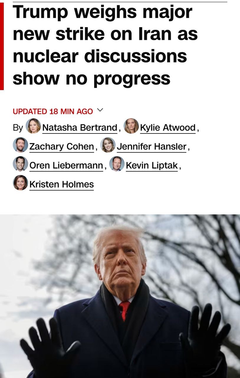 О подготовке удара сообщает и CNN. По данным телеканала, президент США Дональд Трамп рассматривает нанесение мощного удара по Ирану после безрезультатных переговоров между Вашингтоном и Тегераном об ограничении ядерной программы страны, производства и дальности баллистических ракет. У Трампа обсуждают разные варианты действий, включая удары по ядерным объектам, военной и правительственной инфраструктуре, а также по представителям руководства, отвечающим за безопасность.