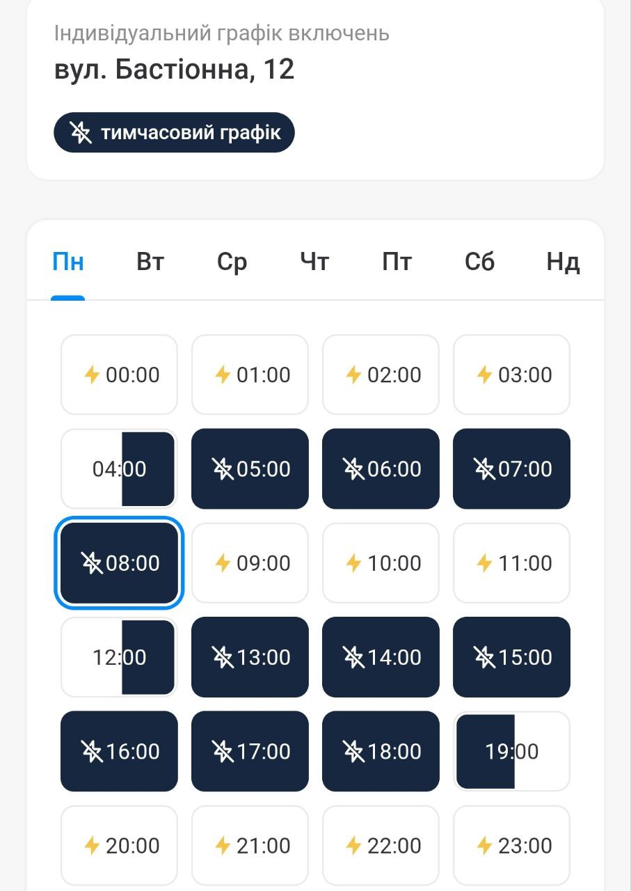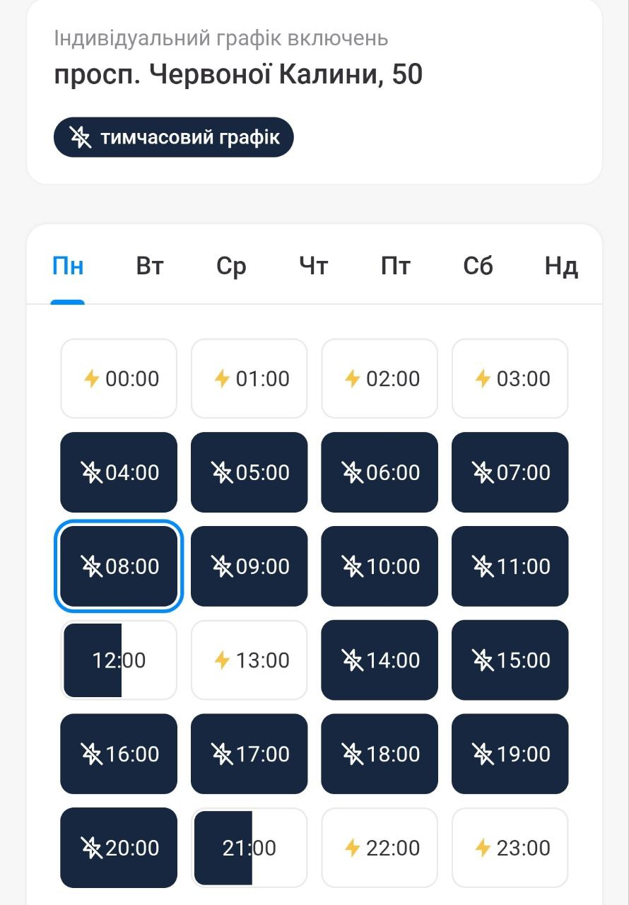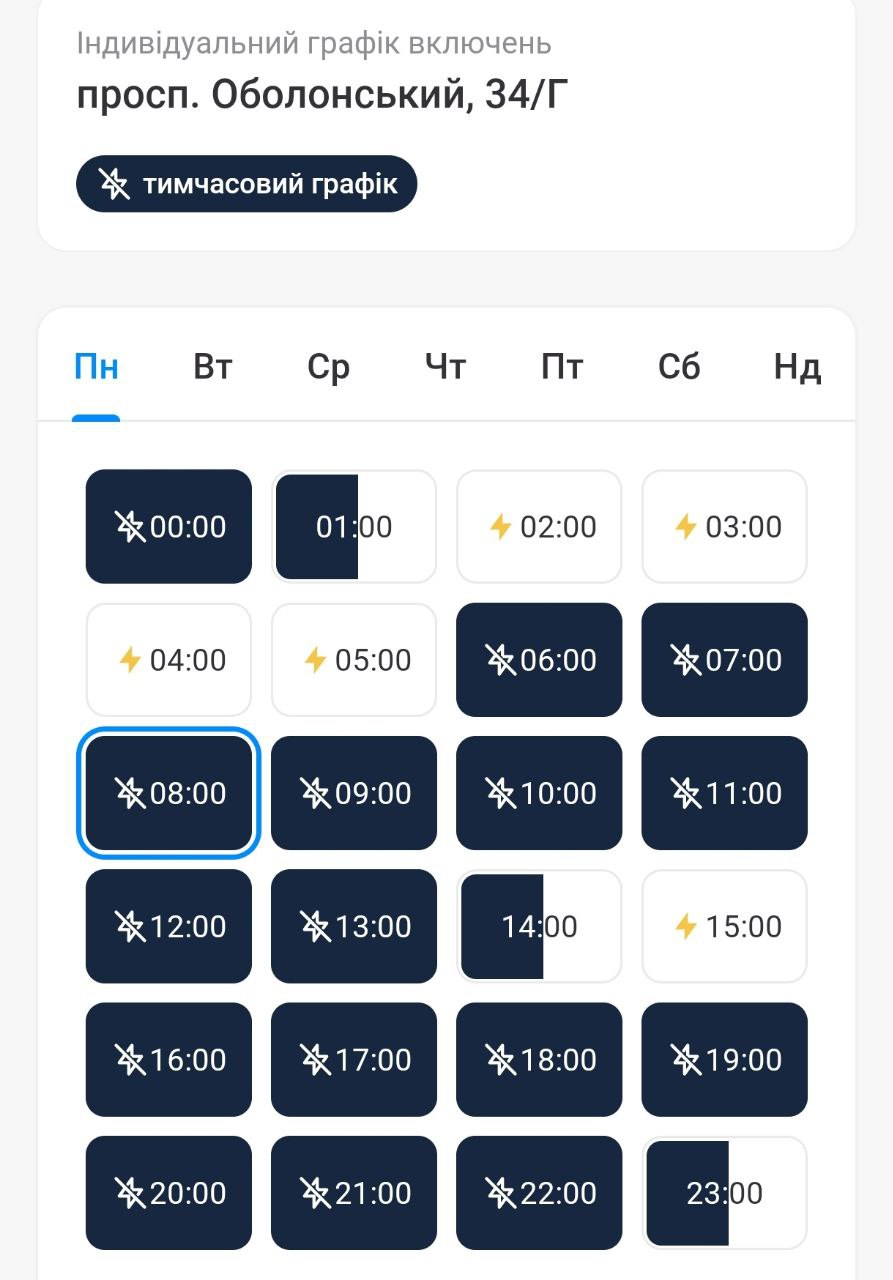 По данным индивидуальных графиков ДТЭК в приложении "Киев цифровой", на Троещине в доме по проспекту Червоной Калины свет будет отсутствовать около 16 часов в течение дня.