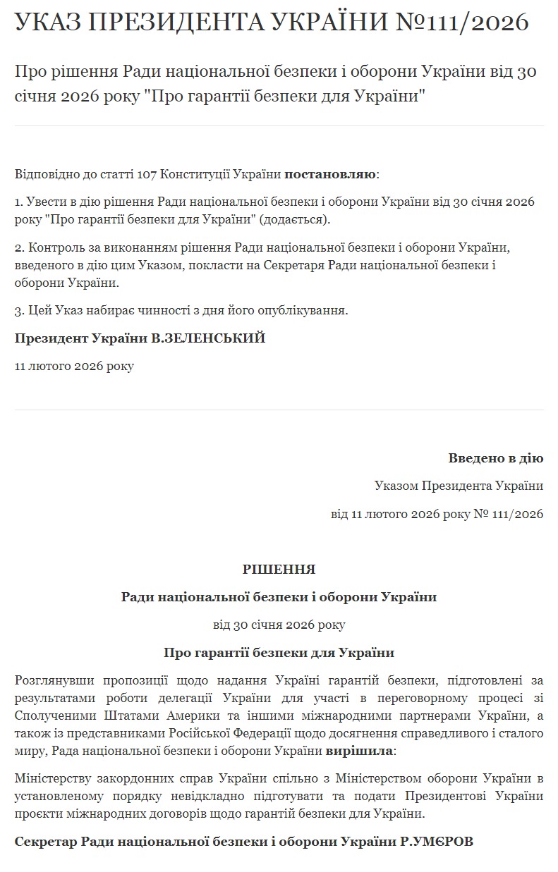 "Рассмотрев предложения о предоставлении Украине гарантий безопасности, подготовленные по результатам работы делегации Украины для участия в переговорном процессе с США и другими международными партнерами Украины, а также с представителями Российской Федерации о достижении справедливого и устойчивого мира, Совет национальной безопасности и обороны Украины решил Министерству иностранных дел Украины совместно с Министерством обороны Украины в установленном порядке безотлагательно подготовить и подать президенту Украины проекты международных договоров по гарантиям безопасности для Украины", - сказано в решении СНБО.