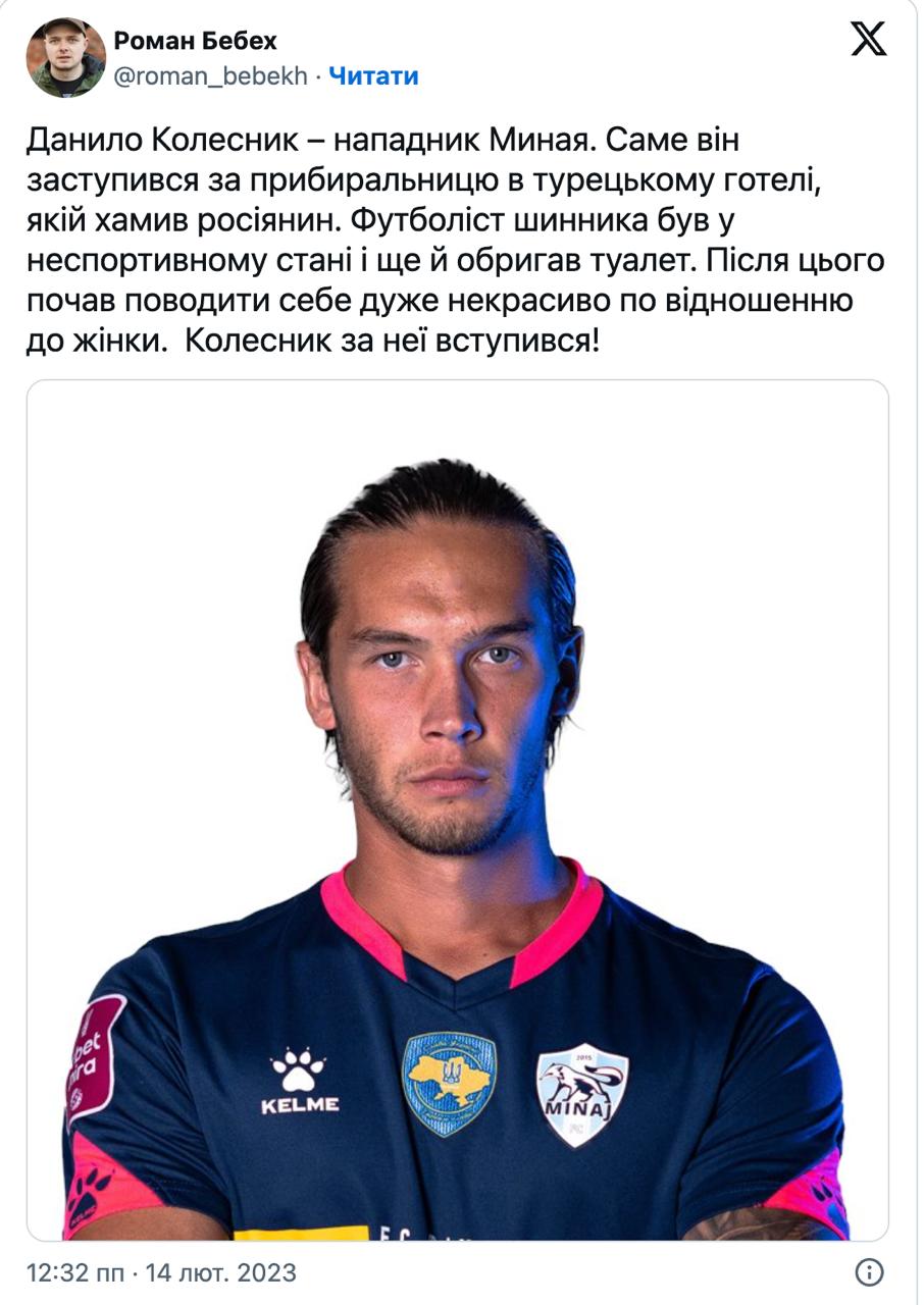 А журналист Роман Бебех напомнил другую историю о Колеснике: футболист, будучи ещё игроком "Миная", заступился за уборщицу в турецком отеле и побил российского футболиста.