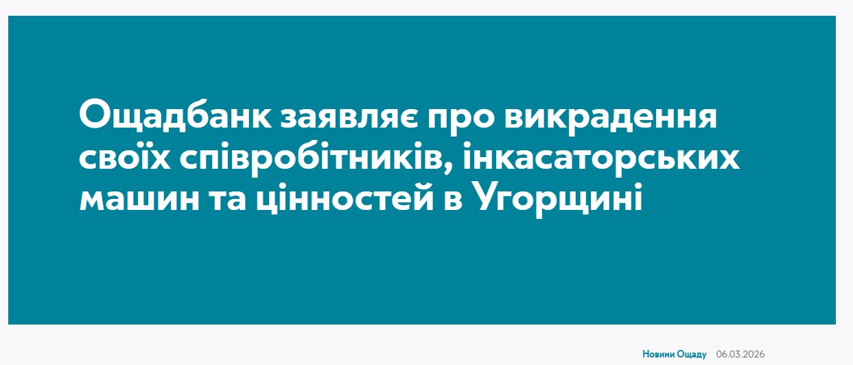 "Два автомобиля инкассаторской службы Ощадбанка, сопровождавшиеся 7 сотрудниками бригады инкассации, были безосновательно задержаны в Венгрии при регулярной перевозке иностранной валюты и банковских металлов между "Райффазен банк Австрия" и Ощадбанком. Согласно данным GPS-сигнала, незаконно задержанные автомобили Ощадбанка находятся в центре Будапешта, вблизи одной из силовых структур Венгрии. Местонахождение автомобилей подтверждено представителями посольства Украины в Венгрии и Министерства иностранных дел Украины. Местонахождение сотрудников Ощадбанка пока неизвестно", - сказано в сообщении.