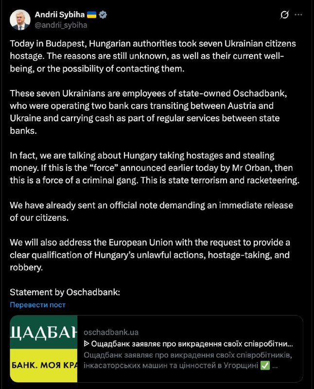 Ситуацию прокомментировал в Х глава МИД Украины Андрей Сибига. Он заявил, что венгерские власти взяли в заложники семерых граждан Украины по неизвестным причинам. Также неясно состояние задержанных.