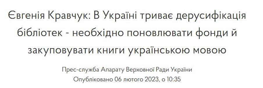 "Загалом співвідношення книг російською та українською мовами в наших бібліотеках дуже сумне. Наразі йдеться про те, що швидше необхідно оновлювати фонди та закуповувати книги українською мовою", – сказала Кравчук.