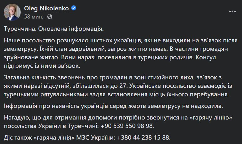 У зоні стихійного лиха після землетрусу у Туреччині не виходять на зв'язок 27 українців. Шістьох українців, які не виходили на зв'язок після землетрусу, вдалося розшукати, їхній стан задовільний, загрози життю немає, в частини з них зруйнувала житло.