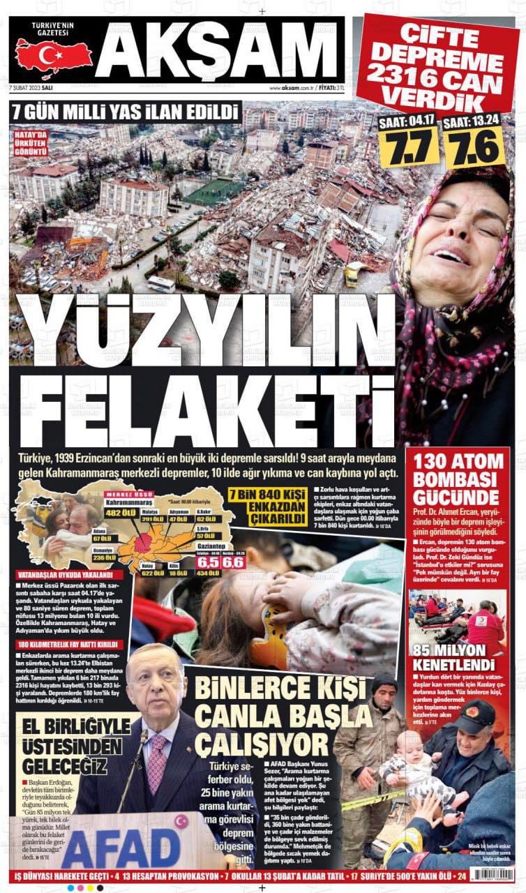 "Катастрофа століття" і "ніби кінець світу" - з такими заголовками вийшли місцеві газети після страшного землетрусу в Туреччині, який убив тисячі людей і ще тисячі покалічивши і залишивши без даху над головою.