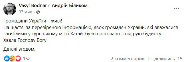 "Громадяни України - живі! На щастя, за перевіреною інформацією, двох громадян України, які вважалися загиблими в турецькому місті Хатай, було врятовано з-під руїн будинку", - написав дипломат.
