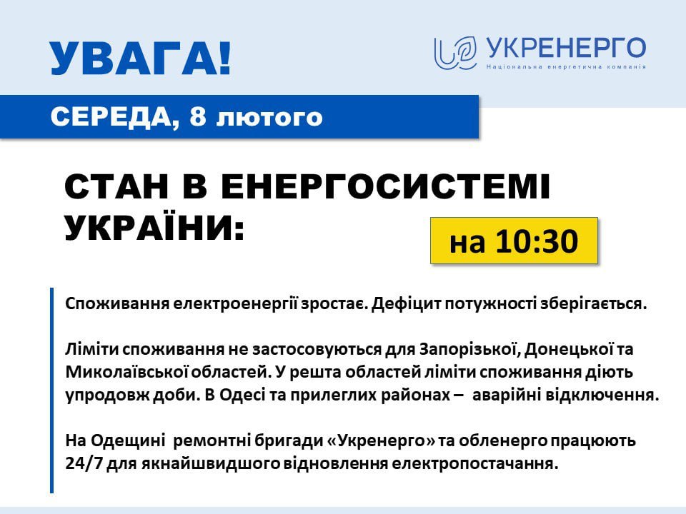 Сьогодні ж повідомляють, що через пошкодження водопроводу в Миколаївській області там не проводитимуть заміри (водопровід - значний споживач, якого важливо враховувати в вимірах Укренерго). Проте ліміти на Миколаївщині все одно не вводяться.