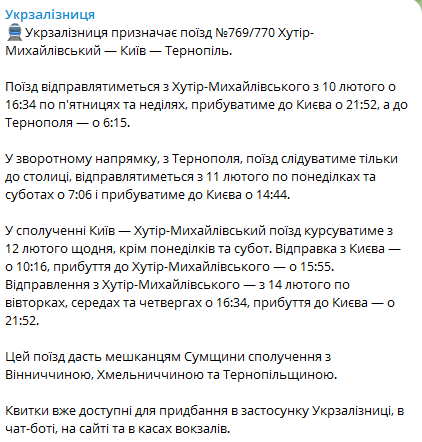 "Укрзалізниця" призначила поїзд №769/770 Хутір-Михайлівський – Київ – Тернопіль, що надасть жителям Сумської області можливість сполучення з Вінницькою, Хмельницькою та Тернопільською областями.