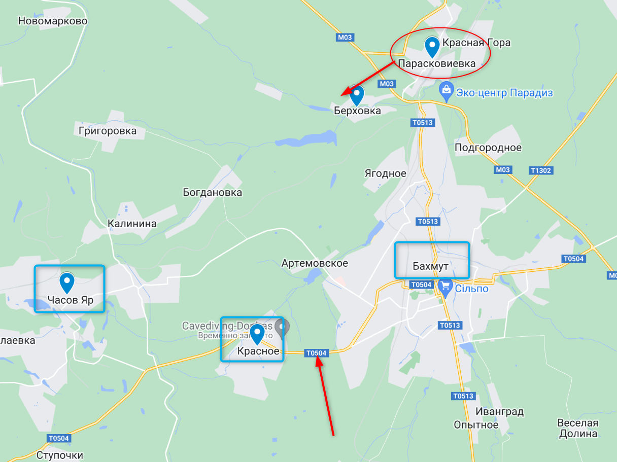 Власне, саме тут і вирішуватиметься доля битви за Бахмут. Якщо росіянам вдасться перерізати ці дві траси, а потім завдати двох зустрічних ударів на північ (від константинівської траси) і на південь (від траси на Слов'янськ), захопити Берхівку на півночі та перейти трасу з Часів Яру до Бахмута, то це створить загрозу повного оточення і, швидше за все, у такому разі українські війська та міста виводитимуть. Але поки що цього не сталося і із західного напрямку ще може здійснюватись постачання міста.