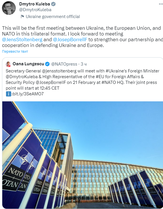 Генсек НАТО Єнс Столтенберг, головний дипломат ЄС Жозеп Боррель та міністр закордонних справ Дмитро Кулеба 21 лютого зустрінуться у Брюсселі. Про це повідомляє прес-служба військового Альянсу.