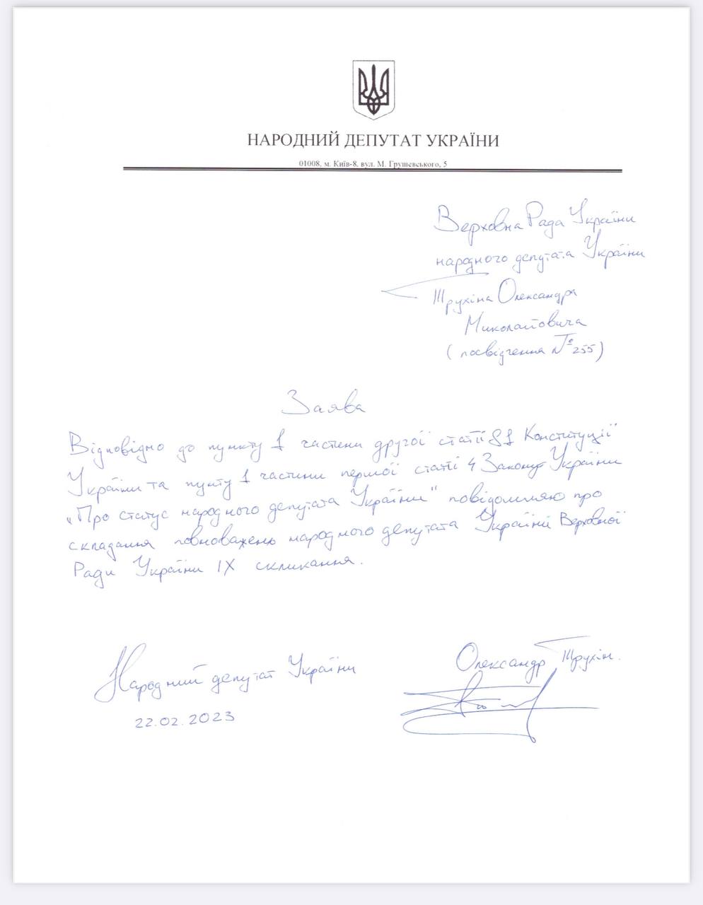 Нардеп Ярослав Железняк опублікував заяву свого колеги Олександра Трухіна, виключену зі "Слуги народу" через справу про хабар, про складання депутатського мандата.