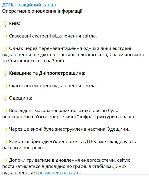 У Дніпропетровській області екстрені відключення, як і у столиці, скасовано.