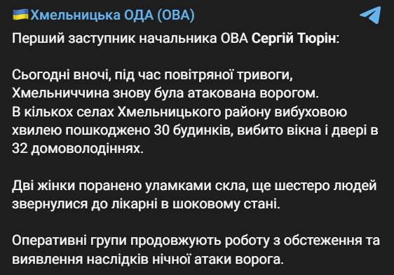 Сьогодні вночі Росія атакувала безпілотниками Хмельницьку область. У кількох селах Хмельницького району вибуховою хвилею пошкодило 30 будинків, вибило вікна та двері у 32 домоволодіннях.