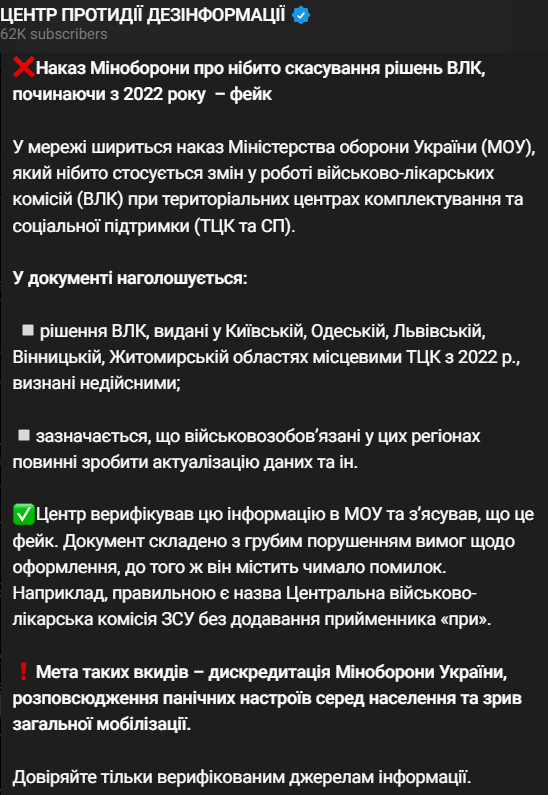"У мережі поширюється „наказ" Міністерства оборони України, який нібито стосується змін у роботі військово-лікарських комісій (ВВК) при територіальних центрах комплектування та соціальної підтримки (ТЦК та СП). У документі наголошується, що рішення ВВК, прийняті у Київській, Одеській, Львівській, Вінницькій, Житомирській областях місцевими ТЦК з 2022 р. визнані недійсними. Зазначається, що військовозобов'язані у цих регіонах мають зробити актуалізацію даних та інше”, - йдеться у повідомленні.