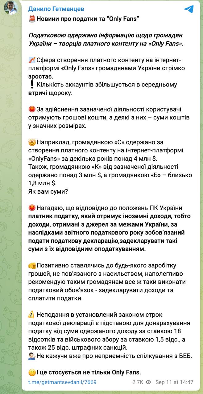 "Громадянка С отримала за створення платного контенту за кілька років понад $4 млн. Також громадянкою К від зазначеної діяльності отримано понад $3 млн, а громадянкою Б – близько $1,8 млн", - написав нардеп.