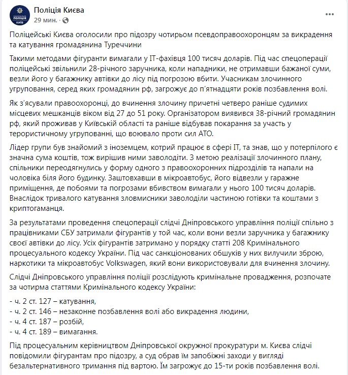 Лідер групи був знайомий з іноземцем, який працює у сфері IT, і знав, що той має значну суму коштів, тому вирішив ними заволодіти. Для реалізації злочинного плану спільники переодяглися у форму правоохоронців та напали на чоловіка біля його будинку. Вони заштовхали його в мікроавтобус, привезли до гаражу та побоями та погрозами вбивством вимагали 100 тисяч доларів. Внаслідок тривалих тортур зловмисники заволоділи частиною готівки та коштами з криптогаманця.