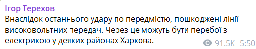"Може бути перебої з електрикою в деяких районах Харкова", - додав він.