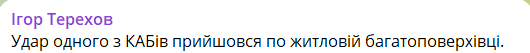 "Удар одного з КАБів припав по житловій багатоповерхівці", - написав мер.