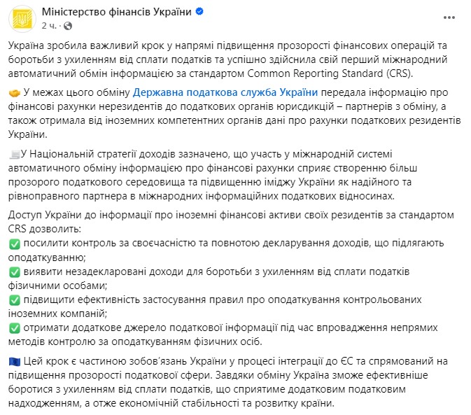 Україна провела перший міжнародний автоматичний обмін інформацією за стандартом Common Reporting Standard (CRS) для підвищення прозорості фінансових операцій та боротьби з ухиленням від сплати податків.