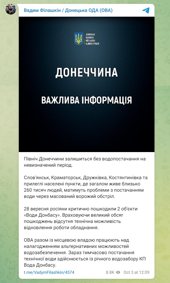 Про це повідомив у своєму телеграм-каналі голова Донецької ОВА Вадим Філашкін.
