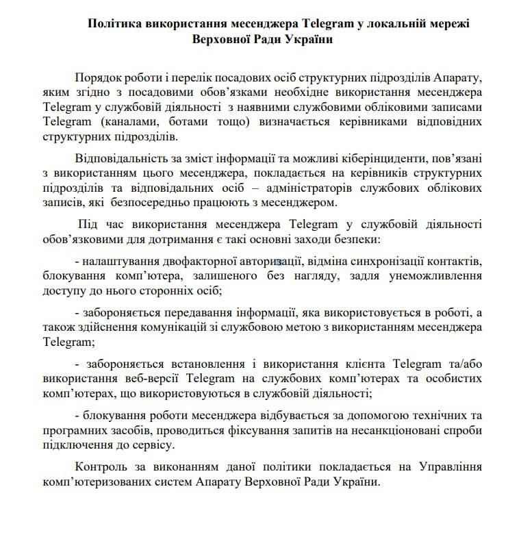 - заборона передачі даних, що використовуються в роботі, та службова комунікація у Телеграм;