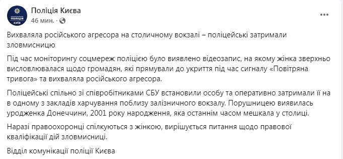 Поліцейські побачили цей ролик під час моніторингу соцмереж. Разом із співробітниками СБУ вони встановили особу жінки та оперативно затримали її в одному із закладів харчування поблизу залізничного вокзалу. Порушницею виявилася уродженка Донецької області 2001 року народження, яка останнім часом проживала у столиці.