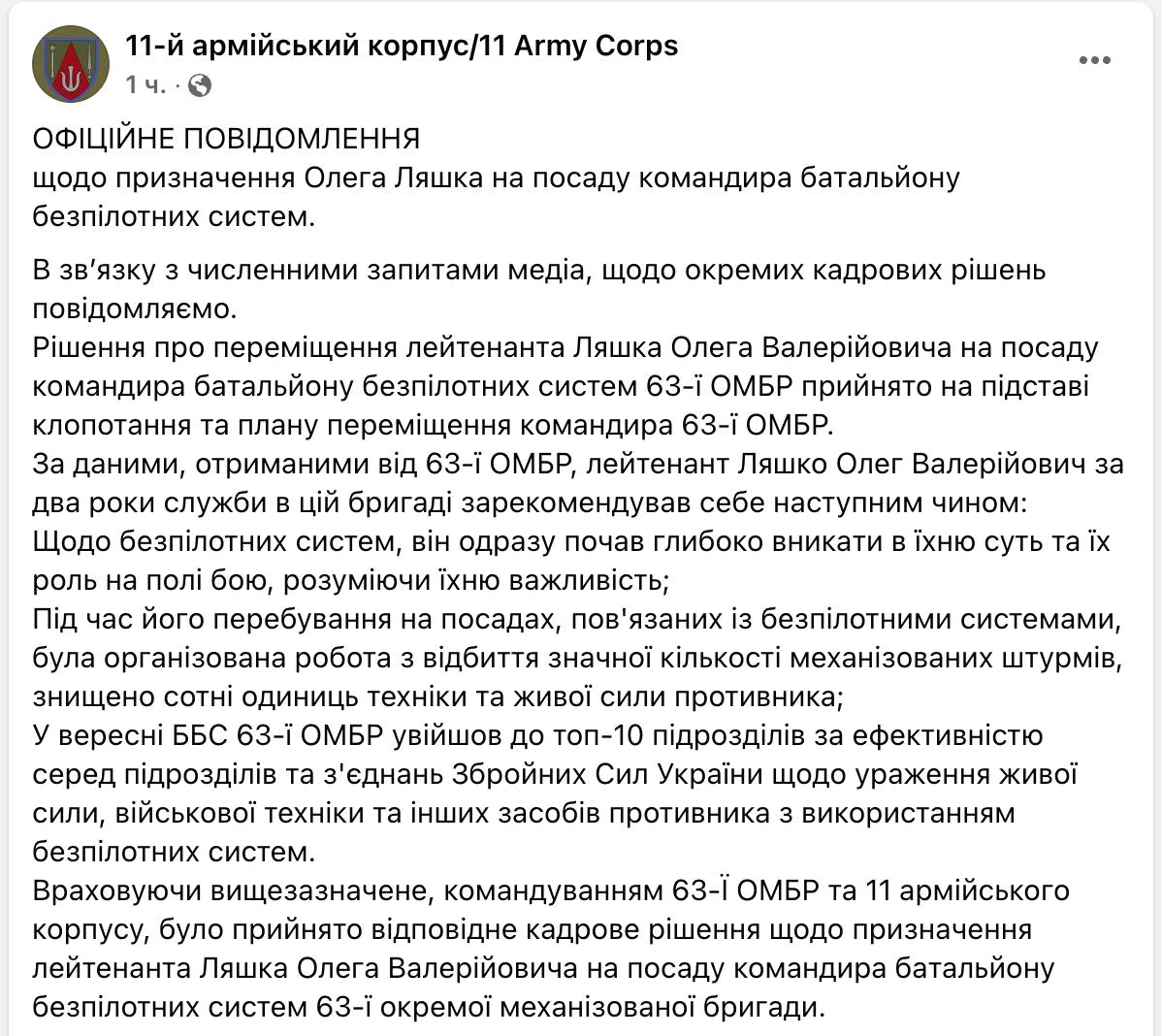 11-й армійський корпус виступив із офіційним повідомленням про призначення лідера Радикальної партії Олега Ляшка на посаду командира батальйону безпілотних систем.