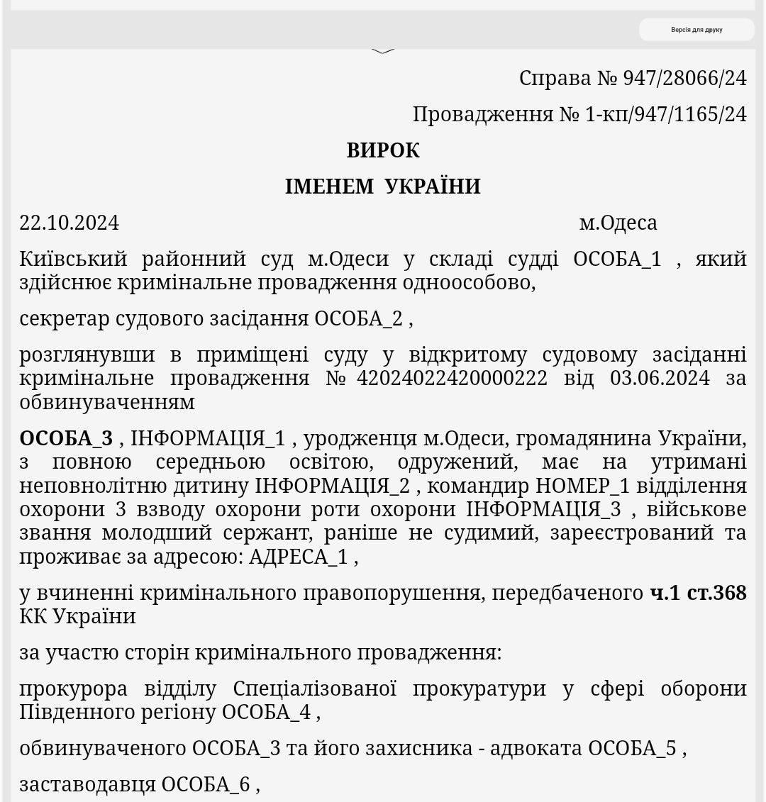 Київський районний суд Одеси оштрафував місцевого співробітника ТЦК на 80 тисяч гривень за те, що той вимагав із чоловіка 4000 доларів за неневручення повістки.