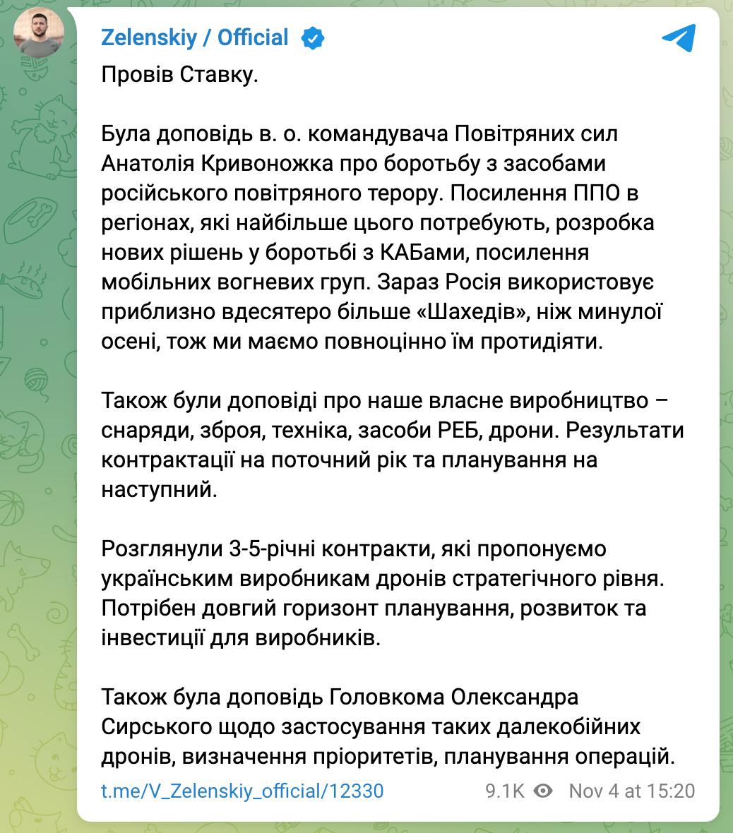 Про це повідомив у своєму телеграм-каналі Володимир Зеленський за підсумками засідання ставки верховного головнокомандувача.