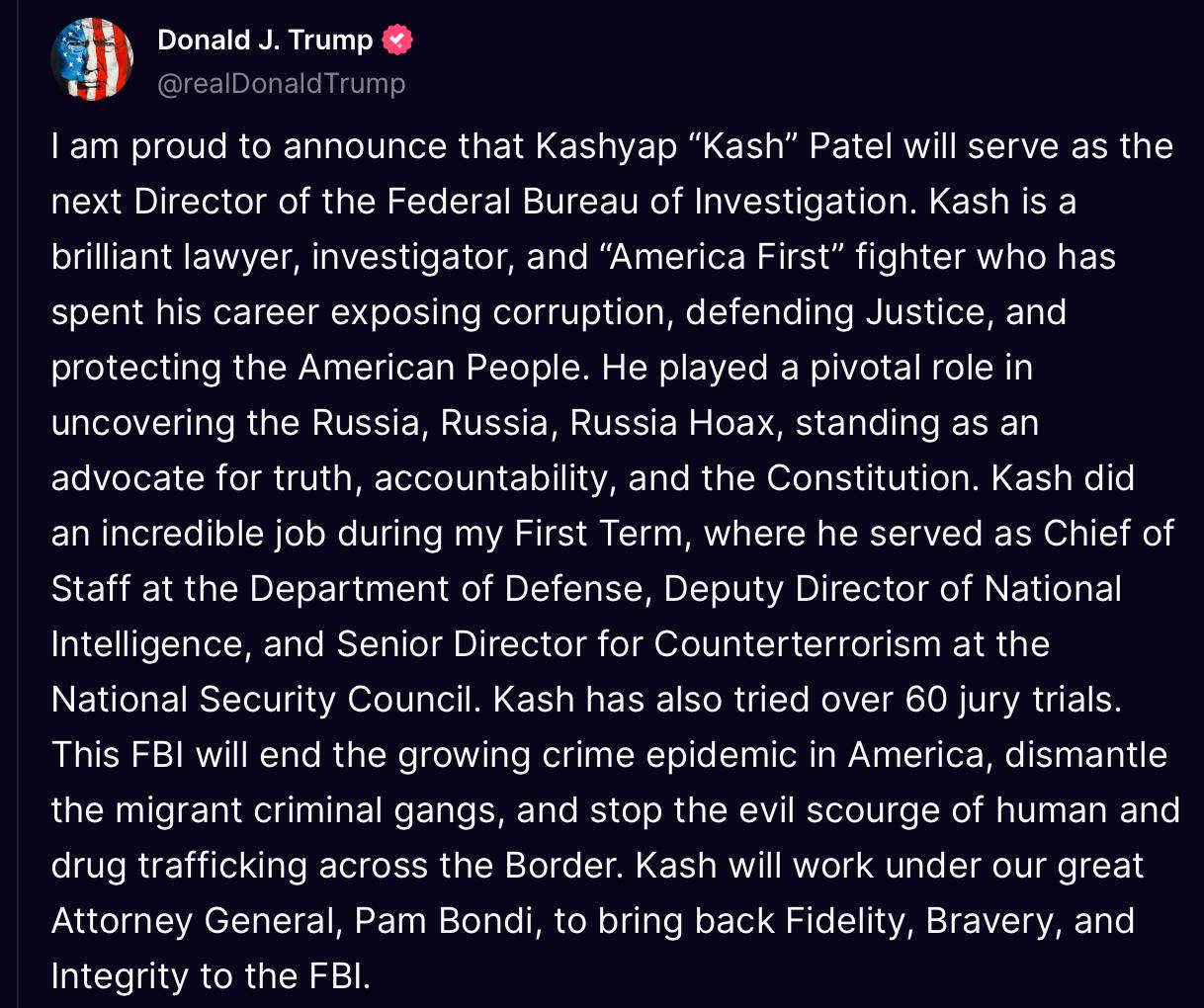 Республіканець висунув у директори бюро Кеша Патела, який обіймав за першого президентства Трампа посади в Пентагоні та Білому домі.