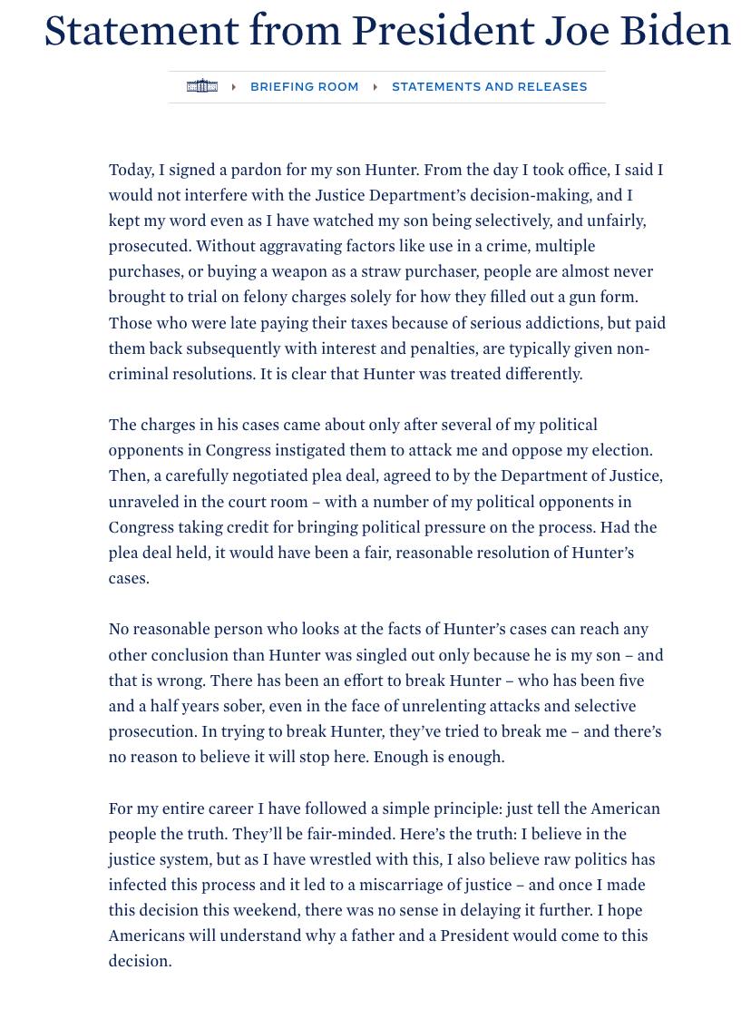 "З першого дня на цій посаді я говорив, що не втручатимуся в прийняття рішень Міністерством юстиції, і я дотримався слова, навіть коли бачив, як мого сина вибірково і несправедливо переслідують", - йдеться у заяві Байдена.