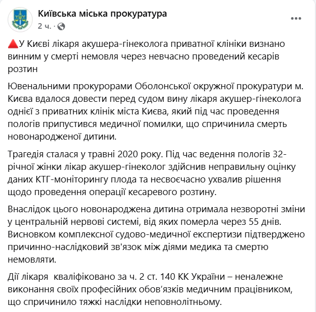 Слідство дійшло висновку, що акушер-гінеколог помітив ознаки погіршення стану плода, але не змінив тактику ведення пологів, щоб урятувати життя немовляті.